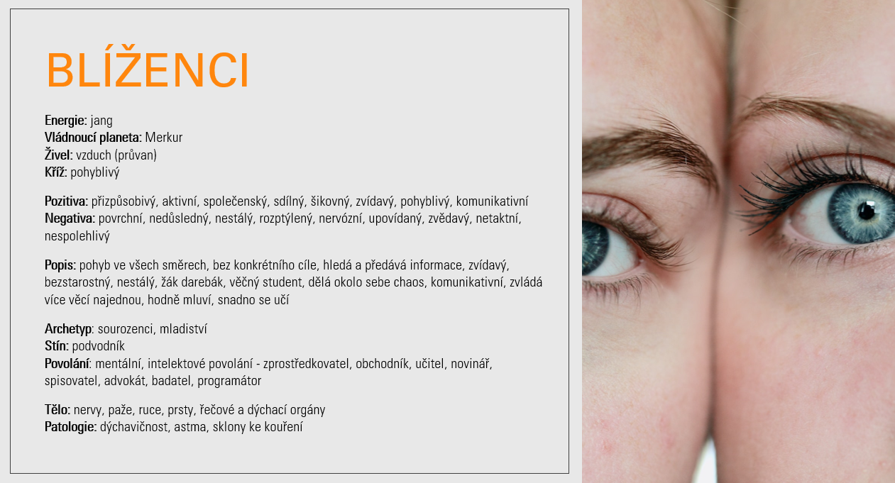 Blížence, stejně tak jako každý jiný archetyp znamení, ve svém životě žijeme určitým způsobem všichni. Intenzivněji ti se Sluncem, Lunou nebo osobními planetami v Blížencích, ale i my ostatní, kdo v nativu žádnou blíženeckou planetu nenajdeme. Podívejte se, v kterém domě vašeho horoskopu Blíženci leží, protože právě tam se chováte blíženecky i vy… to jen tak na okraj, než se začnete cukat, že vám tahle energie nesedí nebo co 😉