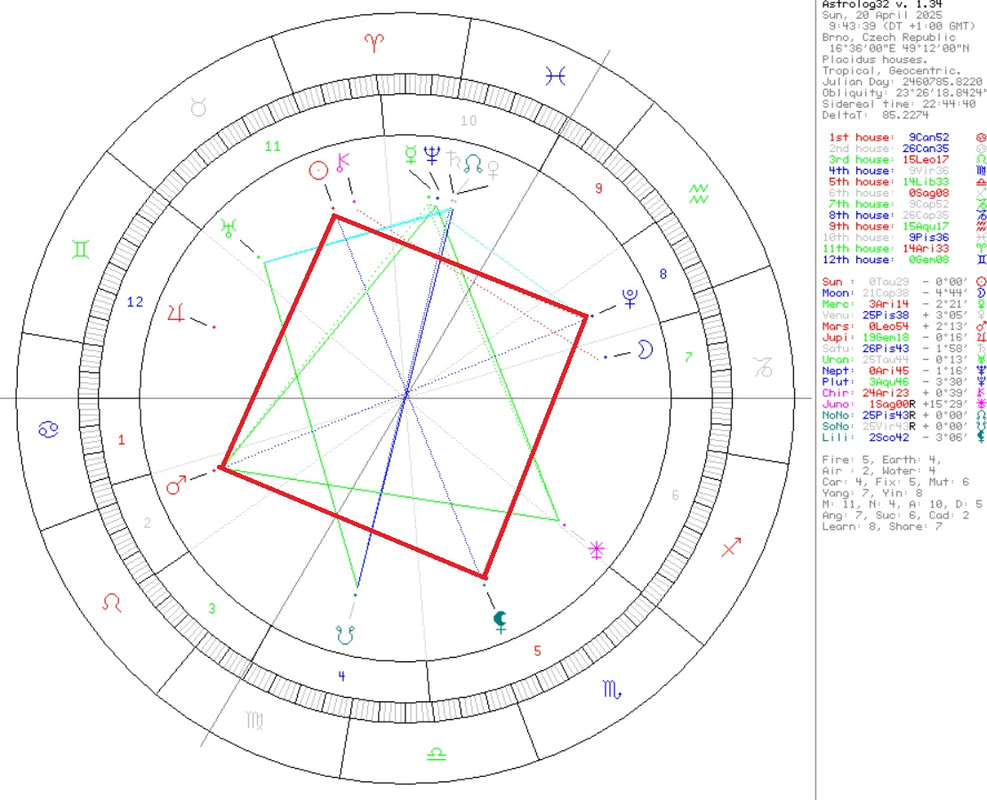 | Mimochodem, astrologicky se právě tato nehybná velká kvadratura připodobňuje právě k přibití na kříž – není možné vesmír/osud/Boha neobdivovat – přesně za momenty tohoto dokonale symbolického načasování! |