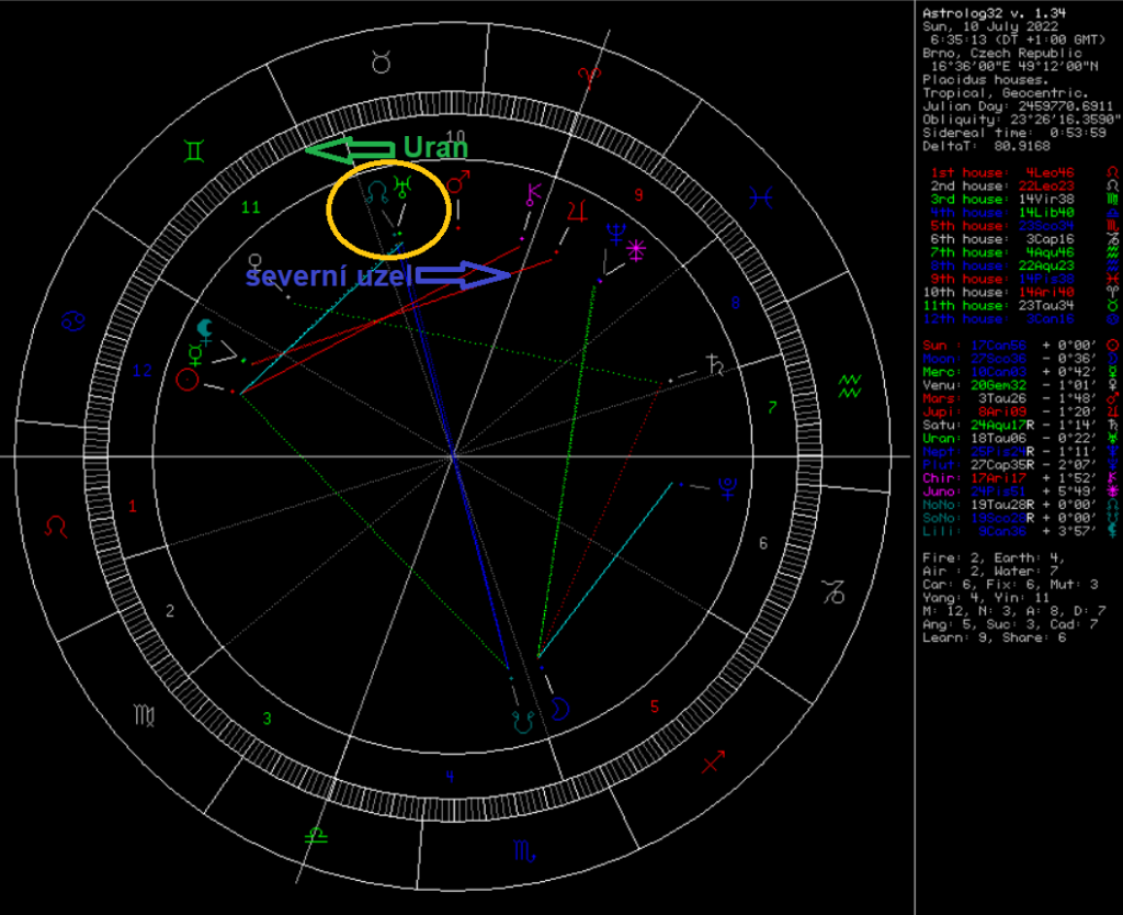 Technicky vzato se potkají 26. července 2022, ale! Jednak na tom tolik nesejde, protože jejich vliv je mohutný a abychom jej zaznamenali, určitě nemusíme odpočítávat sekundy. V podstatě můžeme říct, že do pole působnosti téhle konjunkce vstupujeme právě teď … nebo zítra, nebo včera, jak chcete. Za druhé znovu připomínám, že uvažujeme střední pozici severního lunárního uzlu (tj. optimalizaci bez střídání direktivity a retrogradity), a pokud bychom pracovali s pravou pozicí, termín se o pár dní zpozdí (zájemce znovu odkazuji na efemeridy). A za třetí: jak víme, technicky přesná konjunkce nastavuje situaci, ale de facto čekáme na zážeh. Tedy na průchod některé z rychlých planet, která zafunguje jako katalyzátor. Katalyzátorem tentokrát bude nejprve něžná Luna v roli předjezdce (22.7.2022), a kdyby to nestačilo – protože Býk dokáže být vážně fest rezistentní – přidá se ještě radikální Mars (OK, Mars v Býku, spíš golfista než boxer, ale pořád Mars …), a to přesně 1.8.2022. Počítejme raději 31.7.-2.8.2022. Třaskavé a disruptivní období s akutní potřebou vymanit se ze všeho, co nás omezuje – urvat se z řetězu!1