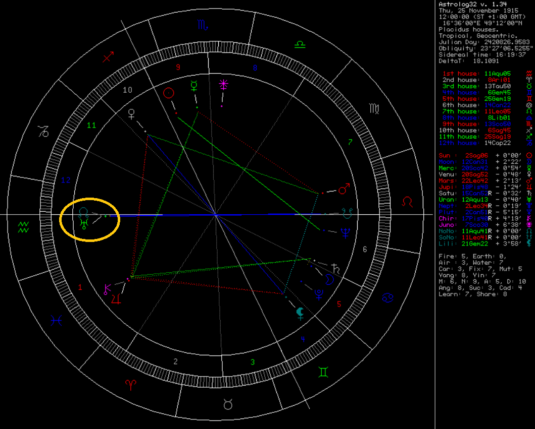 25. listopadu 1915. A co myslíte? Natočili mu EKG a měl ho tam! Horoskop přikládám. Konjunkce Uranu se severním lunárním uzlem je přesná, sice ve Vodnáři, který je zvratům paradigmatu nakloněn podstatně víc než Býk, ale co už: